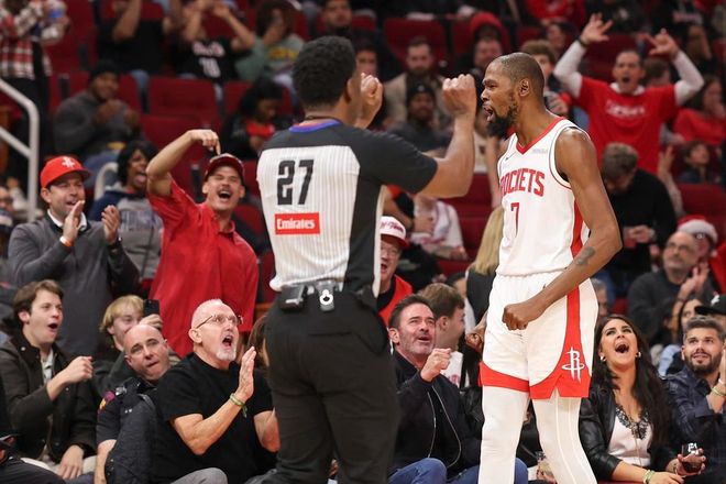 3、杜蘭特持球終結(jié)(立棍單打)確實是比較簡單粗暴,第三節(jié),快船漸漸拉開門差,杜蘭特掌控球權(quán),連續(xù)命中,縮小分差穩(wěn)住局面。但是,杜蘭特這種打法不是烏度卡也不是杜蘭特想要的,這種手段在季后賽或者末節(jié)關(guān)鍵時刻可以一用,但是不適合整場比賽都用,杜蘭特沒有這個體能支撐,也對火箭的年輕球員成長不利!杜蘭特此役14中5,3分5中3,得到16分3助攻。