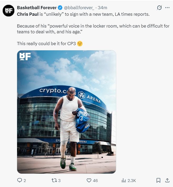 根據(jù)《洛杉磯時報》的報道,克里斯-保羅不太可能被交易到新的球隊,由于他在更衣室極具感染力的領(lǐng)導能力可能會給球隊帶來不小的困擾,加上保羅已經(jīng)是一位40歲的老將,這或許就是保羅生涯的終點。