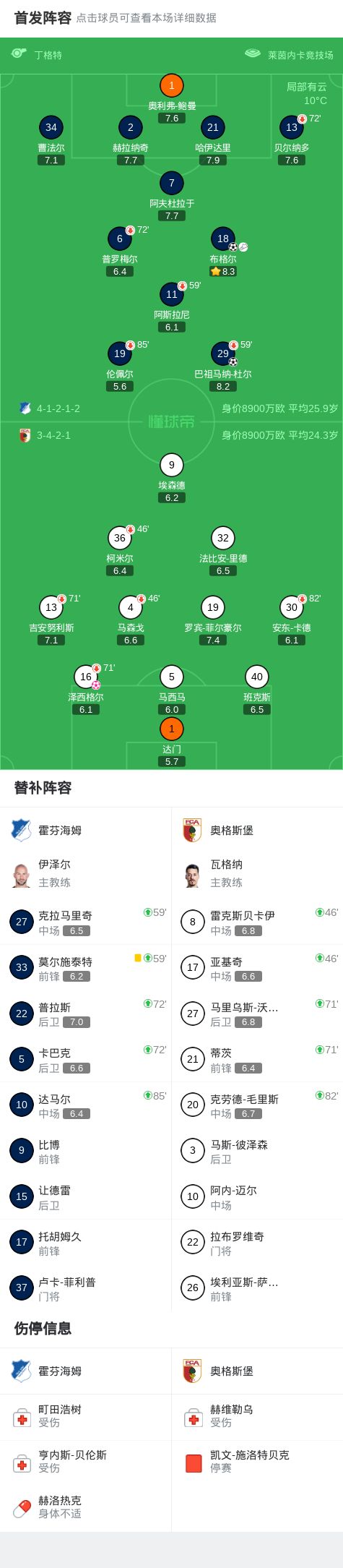 霍芬海姆3-0大勝奧格斯堡,布格爾1射1傳,巴祖馬納-杜爾破門