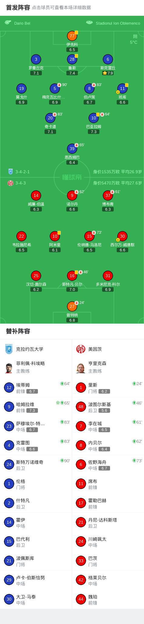 克拉約瓦大學(xué)1-0美因茨,哈姆拉維點(diǎn)射制勝
