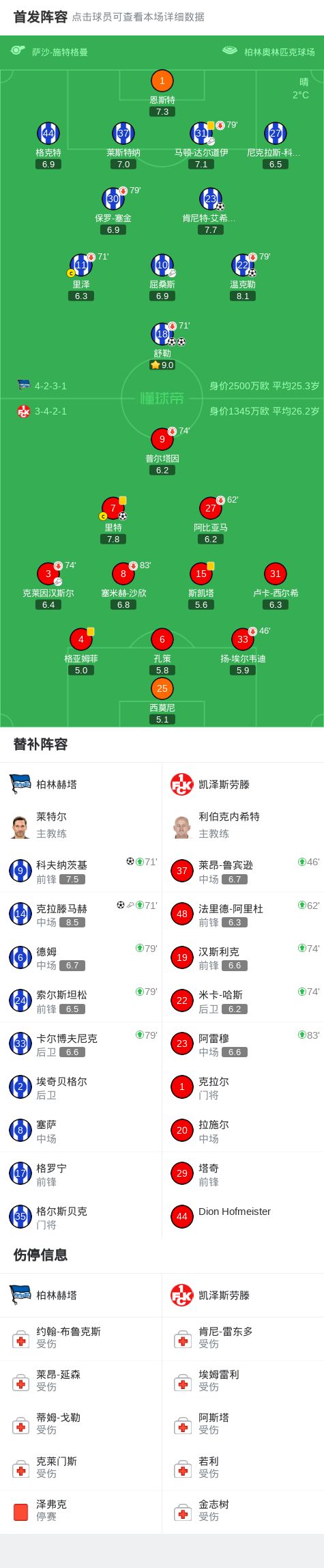 北京時間12月3日德國足協(xié)杯 第三輪,柏林赫塔對陣凱澤斯勞滕。柏林赫塔舒勒梅開二度,溫克勒破門,肯尼特-艾?;舳髌崎T,科夫納茨基破門,克拉滕馬赫破門。凱澤斯勞滕里特破門。最終比分柏林赫塔 6-1 凱澤斯勞滕。