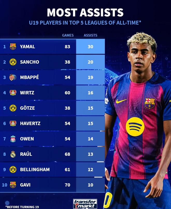 五大聯(lián)賽歷史U19助攻榜:亞馬爾、桑喬、姆巴佩前三